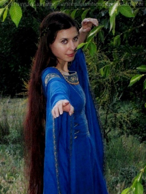 When I'm cosplaying Lúthien Tinúviel from Tolkien's Silmarillion, I usually wear my hair loose with heatless curls on the ends and a simple braided half-up with leaf ribbons, gems and/or small white flowers (I'll be posting some pics of that style in the near future).